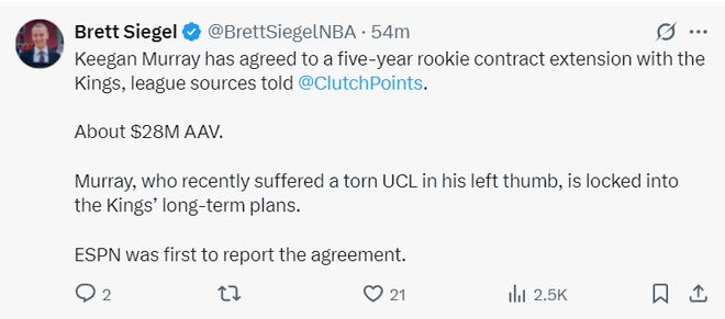 随后Shams又透露,国王队与22年第四顺位的基根-穆雷达成五年1.4亿的提前续约,这份合同不包含球员选项、球队选项,这份合同将在2030-2031赛季才到期。