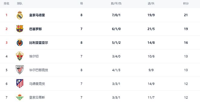一场3-1,让西甲榜首又易主,巴萨掉第2,前2差2分,皇马8场7胜
