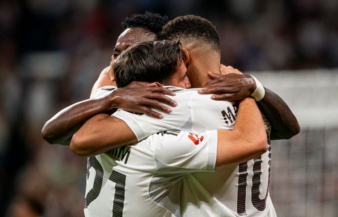 本场比赛皇马排出4231阵型。姆巴佩顶在最前面。马斯坦托诺、居莱尔和维尼修斯的进攻组合联袂出击。楚阿梅尼和塞瓦略斯搭档双后腰。巴尔韦德、米利唐、赫伊森和卡雷拉斯4后卫首发出战。库尔图瓦担任首发门将。罗德里戈、迪亚斯和贝林厄姆坐在替补席待命。