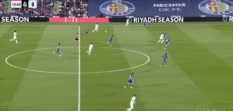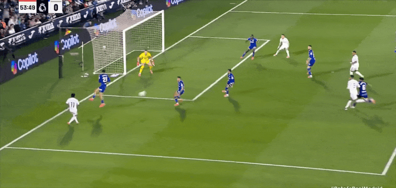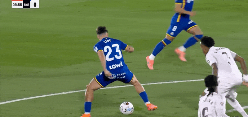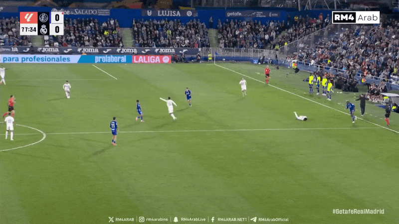 下半场比赛54分钟,赫塔菲后防沟通失误,贝林厄姆冲入禁区用脚尖先完成触球后被赫塔菲门将索里亚绊倒,主裁判同样不予理会,示意比赛继续;